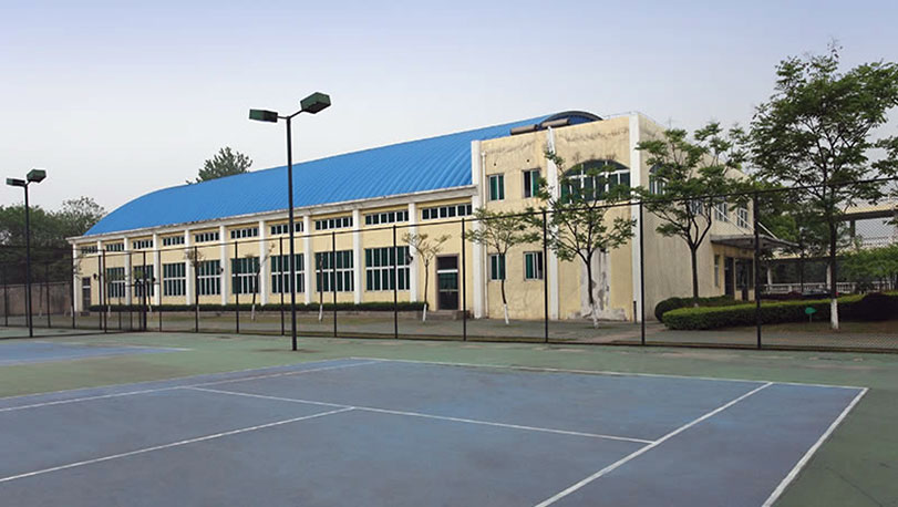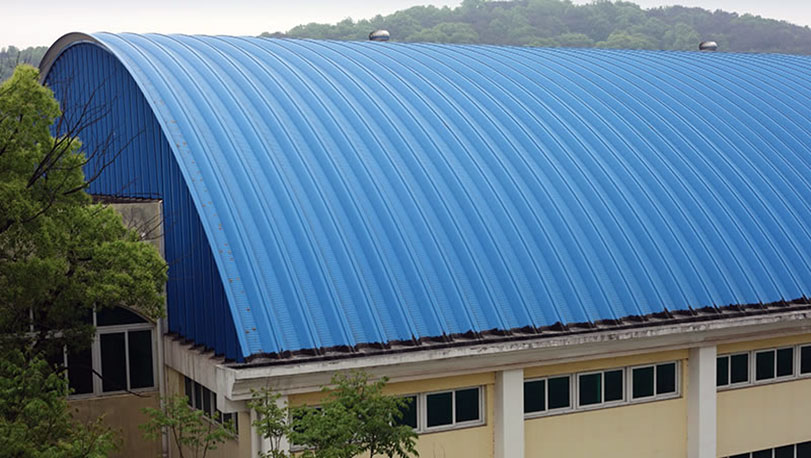 2003年建設(shè),拱型建筑。采用熱鍍鋅PE聚酯彩涂鋼板,顏色為海藍(lán)色,牌號為TS280GD,鍍鋅量180克/平方米。