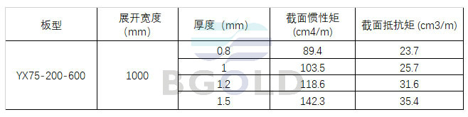 YX75-200-600鍍鋅壓型鋼板截面參數:
