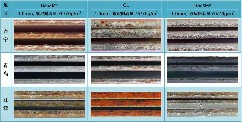 根據(jù)戶外掛片結(jié)果,BaoXM®鍍層在典型海洋氣候、酸雨氣候均表現(xiàn)出較熱鍍鋅、鍍鋁鋅更強(qiáng)的環(huán)境耐蝕性。