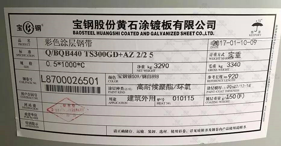 上海寶鋼彩涂卷噴碼為:BAOSTEEL+TDC51D+AZ/Z+涂層代碼+捆包號+合同號、且上海寶鋼彩鋼板自2017年起生產(chǎn)的彩涂板背面每隔2米均有二維碼噴碼可隨時掃碼防偽;
