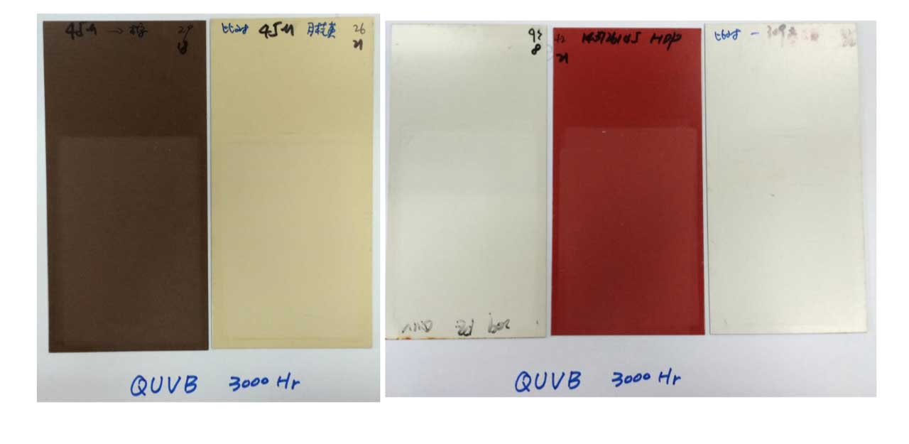 經(jīng)過(guò)3000小時(shí)QUVB試驗(yàn)后,45微米氟碳產(chǎn)品涂層粉化仍保 持0級(jí)。