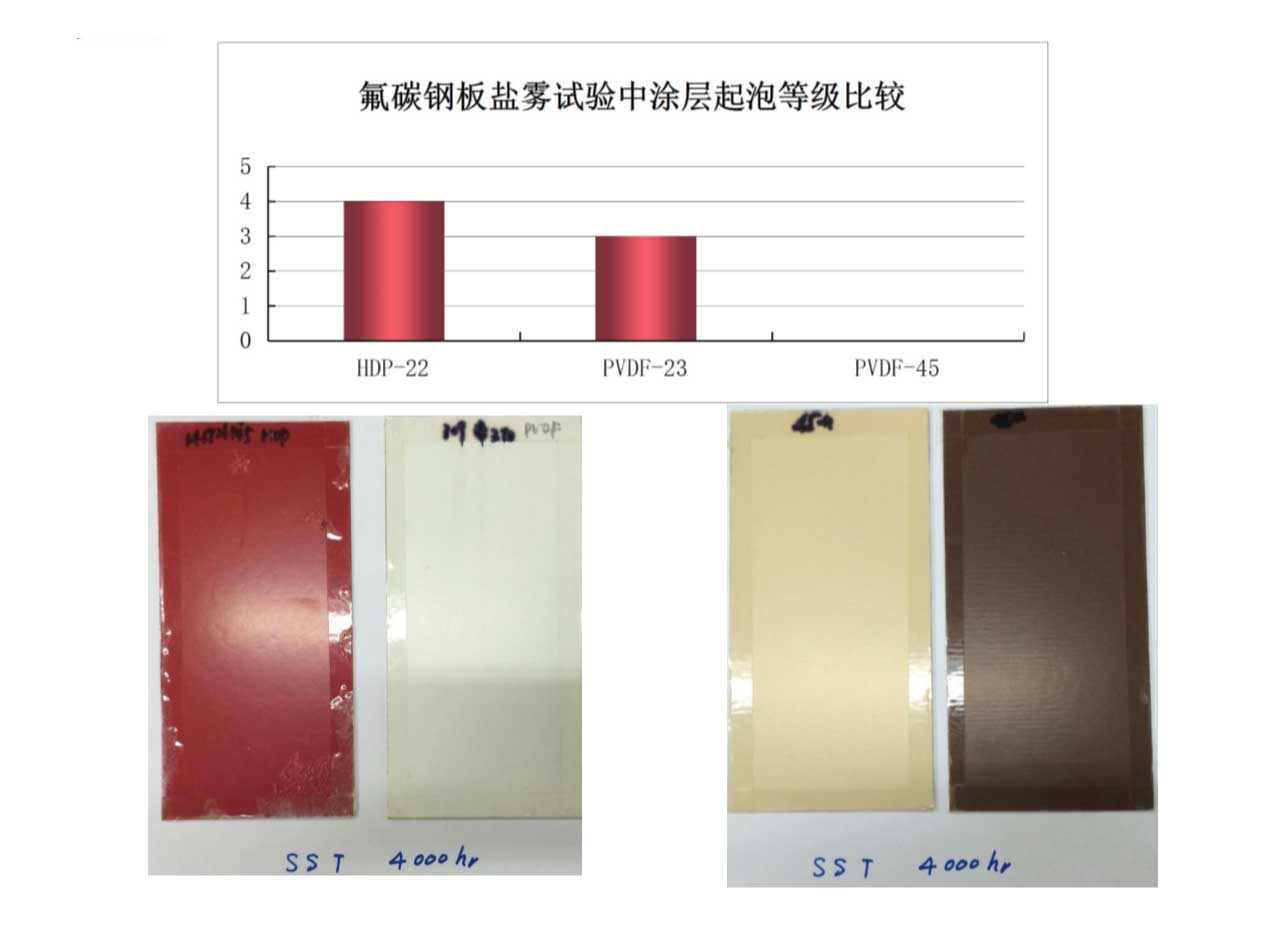經(jīng)過(guò)4000小時(shí)鹽霧試驗(yàn)后,45微米氟碳產(chǎn)品涂層仍保持0級(jí)。