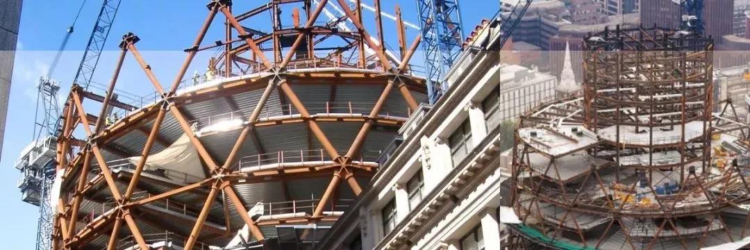 結構形式為鋼框筒外加螺旋網格,六角形節(jié)點板連接各向網格以及樓面梁。