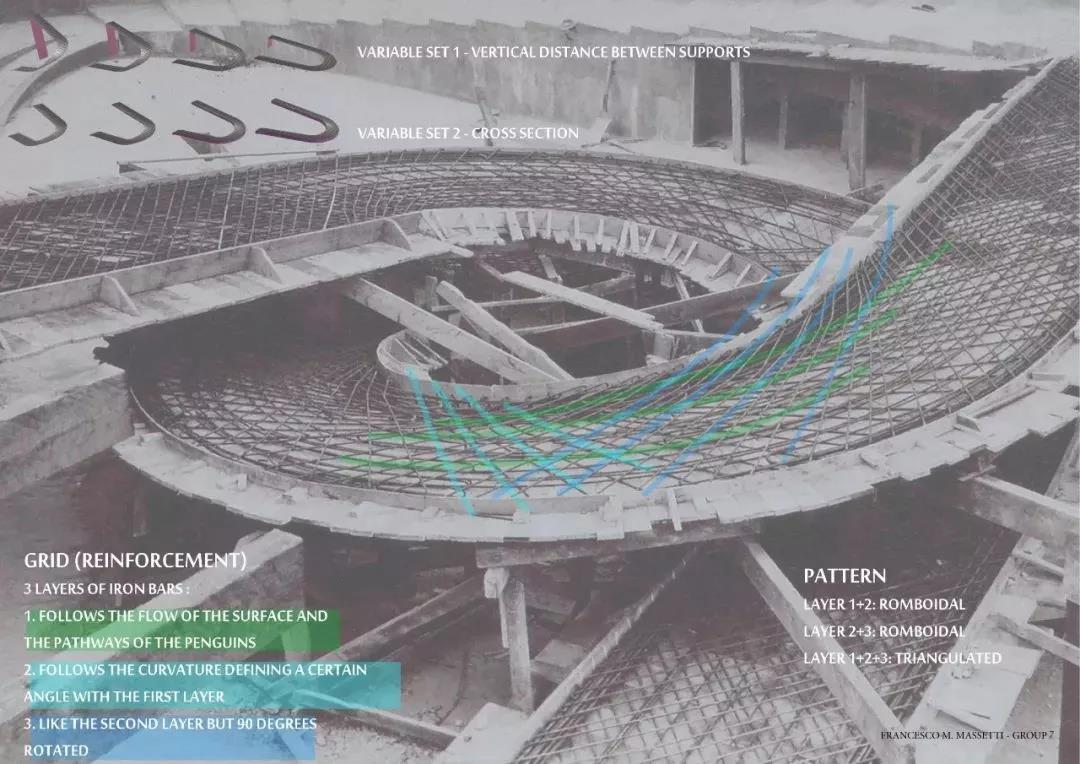 雙螺旋樓梯主要支撐在外圈的索網上,所以螺旋外側做強,為較粗圓鋼管,同時連續(xù)的雙螺旋樓梯也提高了索網的穩(wěn)定性。