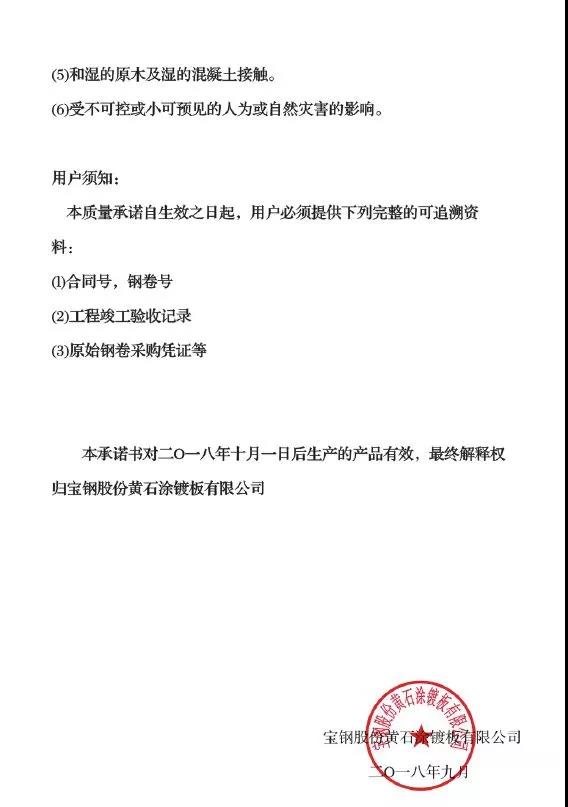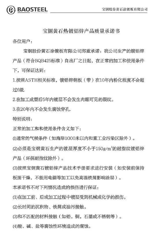 熱鍍鋁鋅20年產(chǎn)品使用承諾書