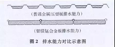 2)最大限度地利用面板橫截面積排水,排水效率高。與普通金屬壓型板排水能力對(duì)比,見圖2;