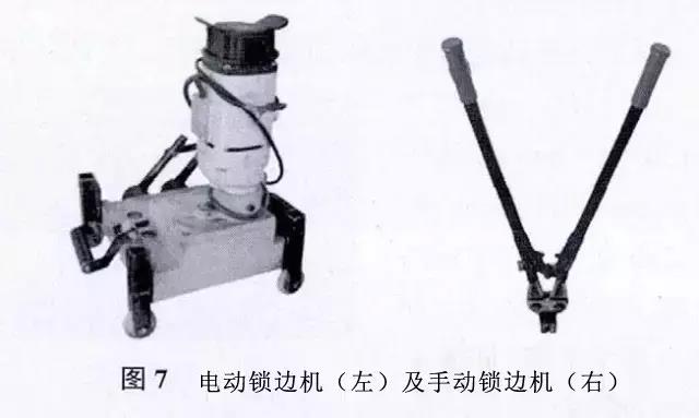 2)手動(dòng)鎖邊機(jī),在用電動(dòng)鎖邊機(jī)之前先用手動(dòng)鎖邊機(jī)鎖緊板端,以便于電動(dòng)鎖邊機(jī)入位,見圖7(右)。