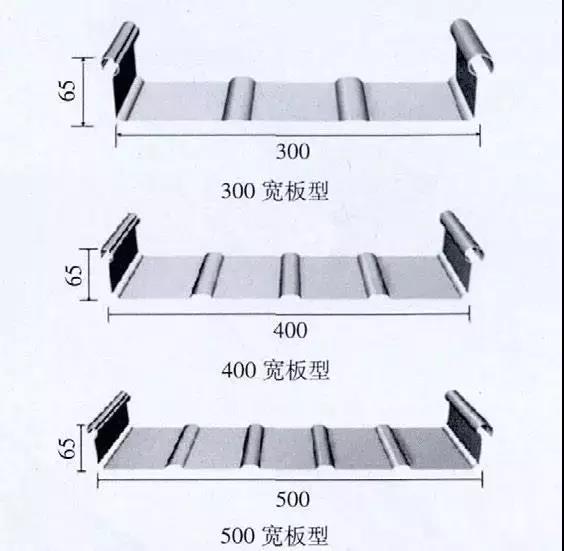 直板板型肋高一般為65 mm,常用的板寬有300mm、400 mm 及500 mm(圖9)。其中板寬300mm 的在屋面荷載較大時(shí)使用;400 mm 的為常用、經(jīng)濟(jì)型的;500 mm 的為屋面板本身最經(jīng)濟(jì)的板型,但下部檁條間距小,且需采取適當(dāng)措施防止板變形。板型詳況,見圖10。